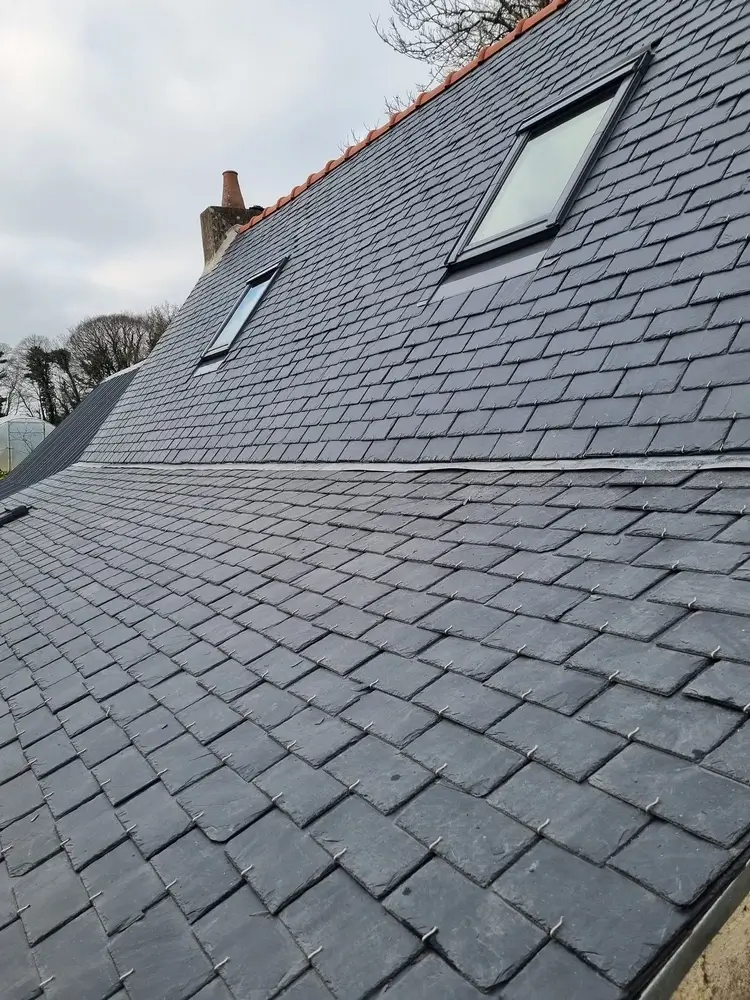 Une fois votre nouvelle couverture posée, il faut l'entretenir régulièrement, le but étant d'avoir toujours un toit propre dépourvu de trace de mousses et de lichens. Pour ce faire, notre entreprise de couverture Ouest'Eco Rénov vous propose une prestation de nettoyage / démoussage de votre toit, cet entretien consiste à pulvériser un anti-mousse (nous travaillons avec Dalep), ce traitement aura pour fonction de créer un film protecteur hydrofuge et fongicide. Aussi, il se peut que durant la vie de votre couverture, des ardoises viennent à casser et tomber dans les gouttières, il faudra dans ce cas nous contacter afin de réparer les ardoises abîmées par leur remplacement. En général, les crochets en acier inoxydable ne s'altèrent pas avec le temps puisqu'ils sont en inox et non galvanisés comme cela se faisait beaucoup jusqu'à la fin des années 1990. Il faudra aussi être attentif aux éventuelles fuites qui pourraient apparaître au fil du temps à cause d'ardoises cassées. Une inspection de votre toiture est donc à faire de manière régulière par votre spécialiste du toit surtout après de fortes tempêtes.