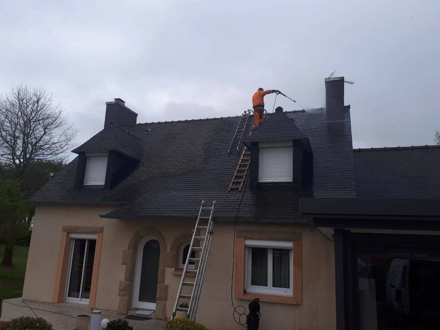 Après acceptation du devis, nos techniciens et spécialistes en rénovation de toiture vont intervenir rapidement chez vous. Dans un premier temps, des échelles de toit vont être installées sur votre maison afin que nos couvreurs puissent progresser en toute sécurité. La première phase consiste au nettoyage / démoussage de la toiture grâce au kärcher réglé en basse pression, en effet en haute pression les propriétés des tuiles faîtières et ardoises risquent d'être altérées par la perte d'imperméabilité voire la création de micro fissures. Pour que le produit imperméabilisant et hydrofuge puisse bien accrocher au support, il est primordial de bien le préparer. Pour cela, toutes les impuretés que ce soit les mousses et lichens doivent impérativement être retirées. Ensuite, il faut attendre que le toit soit totalement sec, à température ambiante de 20 °C et plus, cela prend en général une heure ou deux. La toiture sèche et débarrassée des ses résidus, l'application d'une peinture de toit hydrofuge de type professionnel peut donc être appliquée. Nous travaillons avec les meilleures marques du marché comme Sika (gamme Sikagard 20 l) et Dalep (Dalep 2100, D21, etc.), Algimousse (Algifuge), il s'agit d'une résine qui s'applique exactement comme une peinture classique, à la différence que celle-ci peut être appliquée en extérieur et est dotée de caractéristiques mécaniques importantes. Ce produit hautement technique résiste à toutes les conditions climatiques que ce soit le froid, la neige, la grêle, la chaleur, etc. et a un fort pouvoir couvrant sur les ardoises naturelles, les ardoises en fibro ciment, les tuiles en terre cuite, béton ou ciment, etc. Le but n'est pas d'imperméabiliser l'ensemble mais de le rendre plutôt respirant (peinture de toit poreuse), lorsque ce produit fongicide est appliqué et qu'il a séché, les gouttes de pluie glissent et n'adhèrent plus, le résultat est surprenant d'autant plus que sa durée de vie peut aller jusqu'à plus de 10 ans.