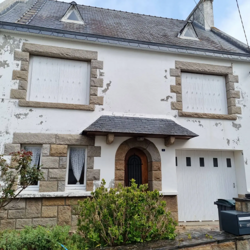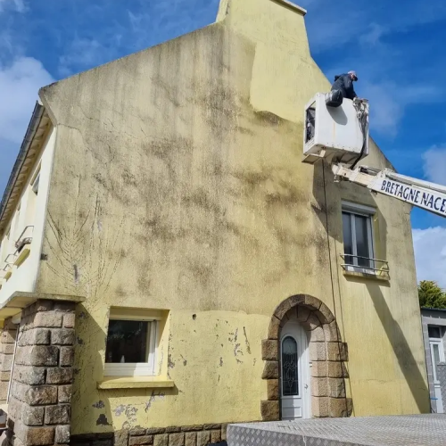Exemple avant / après d'un chantier de ravalement de façades situé à Douarnenez (29100) avec location d'une nacelle élévatrice